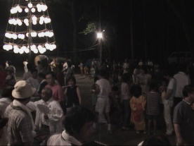 | 夜6時ころから9時にかけて開催された盆踊り。提灯山の下で踊っているのは一部の方のみ。 途中県会議員のあいさつなどがあった。夜店はジュース以外は2000匹の金魚等は完売となった。 あとかたずけは区会、保存会等の方により2時間ほどで終了し一部は翌日に行われた。 |