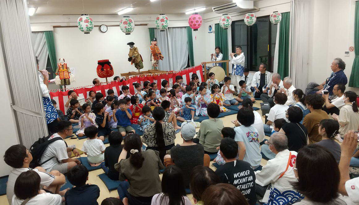 2回目の演技の前にでくの動きについての説明がおこなわれた。笛演奏の子どもは40人。